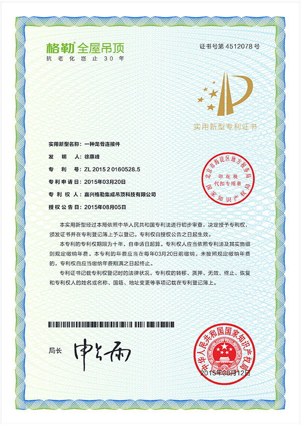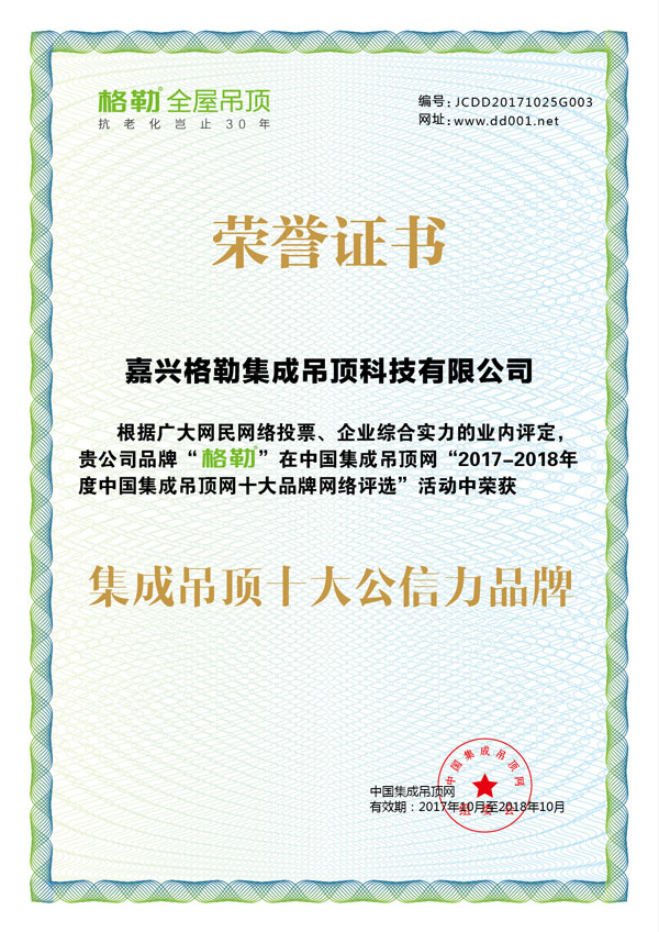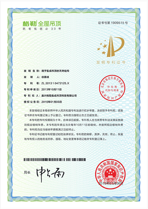 格勒作為專注于家居建材的高端品牌,累計取得專利88項,對產品的創新和研發不斷加大投入,2019年擬成為國家高新技術企業。同時格勒先后被授予“十大公認品牌”“十大新銳品牌”“客廳吊頂藝術大獎”“十大公信力品牌”“產品創新品牌”等榮譽。格勒立志于“為每個家的健康和品味做出貢獻”;秉承“成就客戶、以人為本”的企業宗旨,不斷砥礪前行。