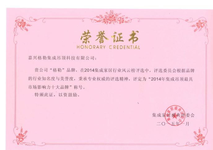 作為集成吊頂的發源地,嘉興這幾天連續降溫,如同2014年的建材環境一樣,然而2015年1月16日是個值得全體“格勒人”紀念的日子,即使周圍環境再怎么不好,格勒吊頂依然表現強勁,獲評2014年集成吊頂最具行業影響力十大品牌!