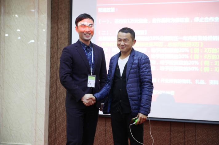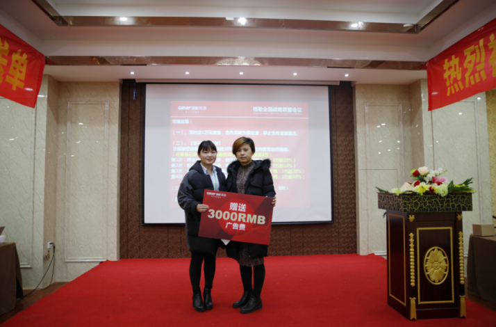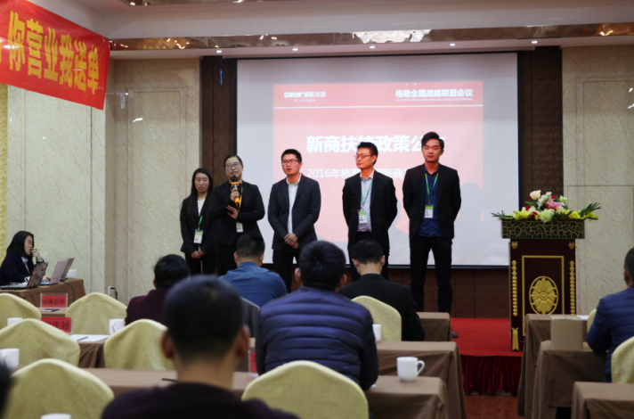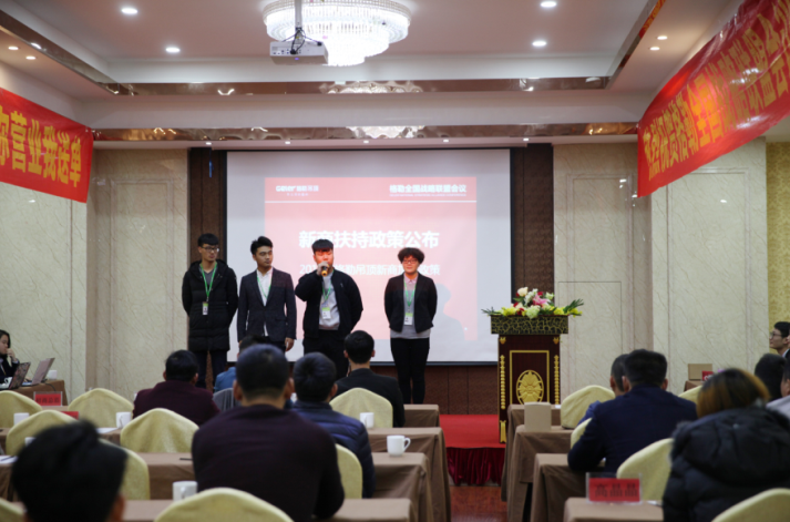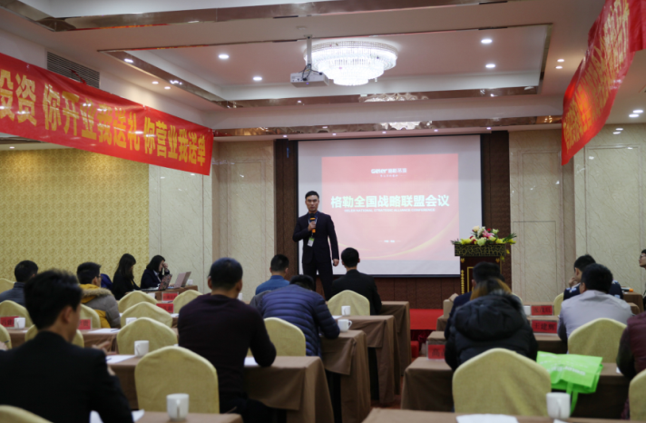 接著便是招商總監施總致辭,施總邀請了格勒各部門的代表上臺,家人們紛紛講述了自己部門的職責并熱情邀請在場的意向經銷商加盟格勒。隨后,施總為參會者細致地描述扶持政策,“你開店我投資”,“你開業我送單”等政策讓意向經銷商看到加盟格勒的前景。