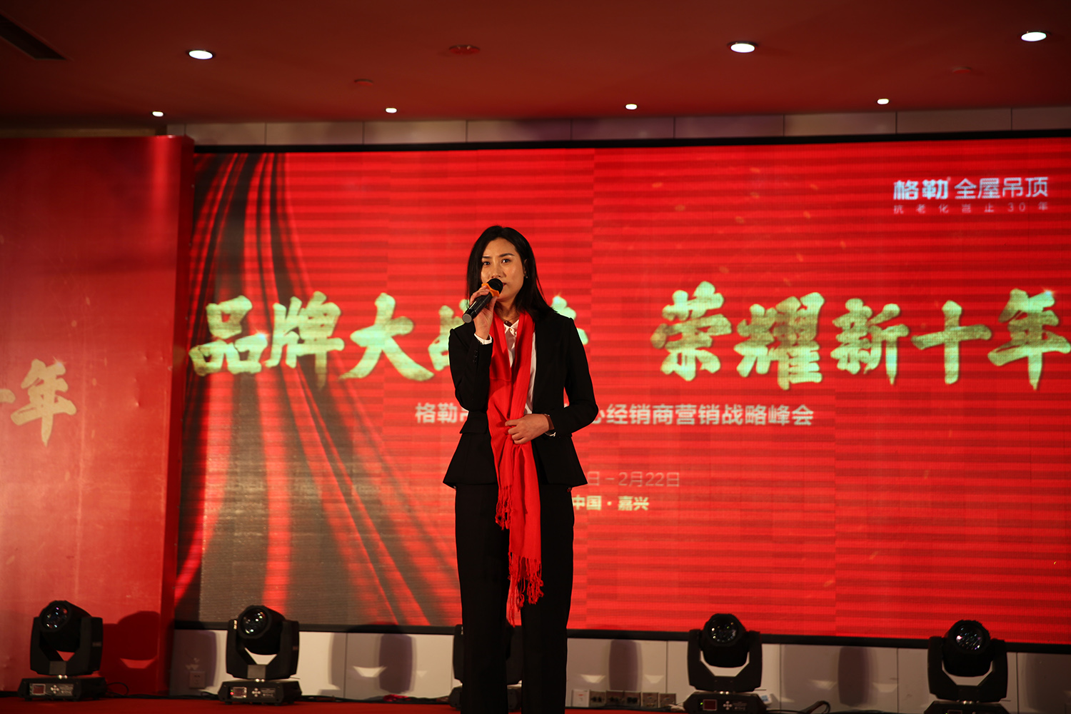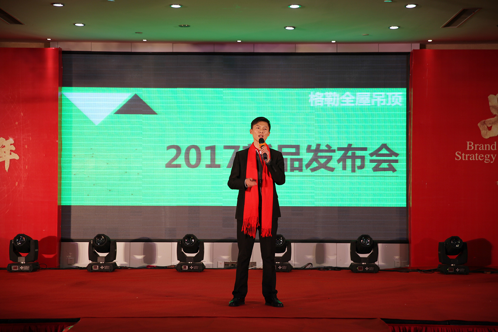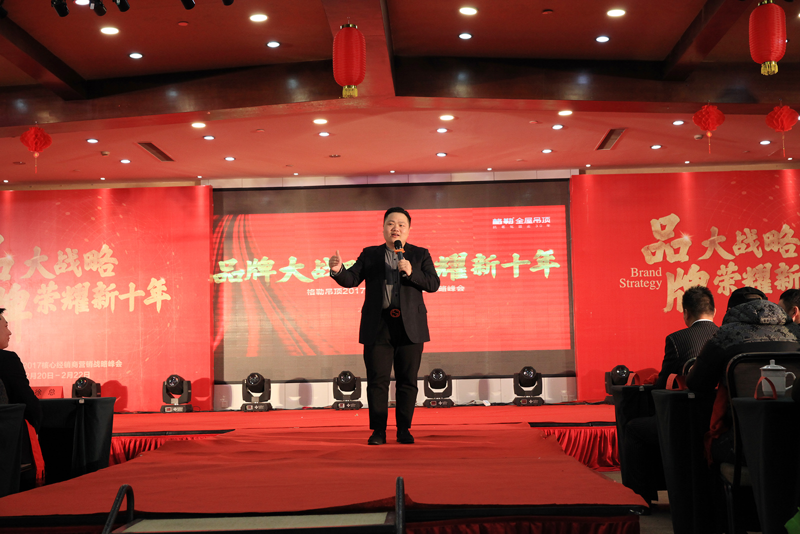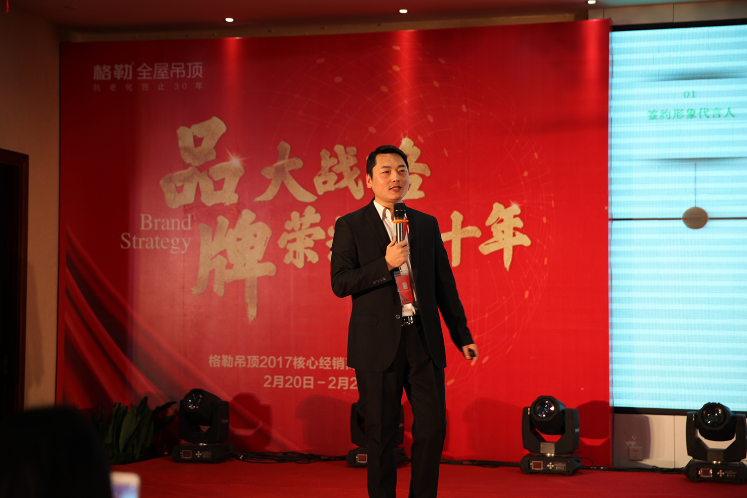 在經銷商家人們全部入座后,會議正式開始。格勒全屋吊頂已經發展十年,對于未來十年的發展,又是如何規劃的呢?首先,由格勒全屋吊頂總經理徐惠峰先生上臺給大家講述2017年整體戰略部署。2017年,是格勒全屋吊頂的“品牌年”,在品牌戰略方面有了很多的提升,包括簽約形象代言人,終端服務、培訓細節的加大,廣告語和logo的提升及廣告全方位覆蓋,新增網點500家,電器產品“質”的飛躍等等,正式開啟格勒全屋吊頂“品牌大戰略”。