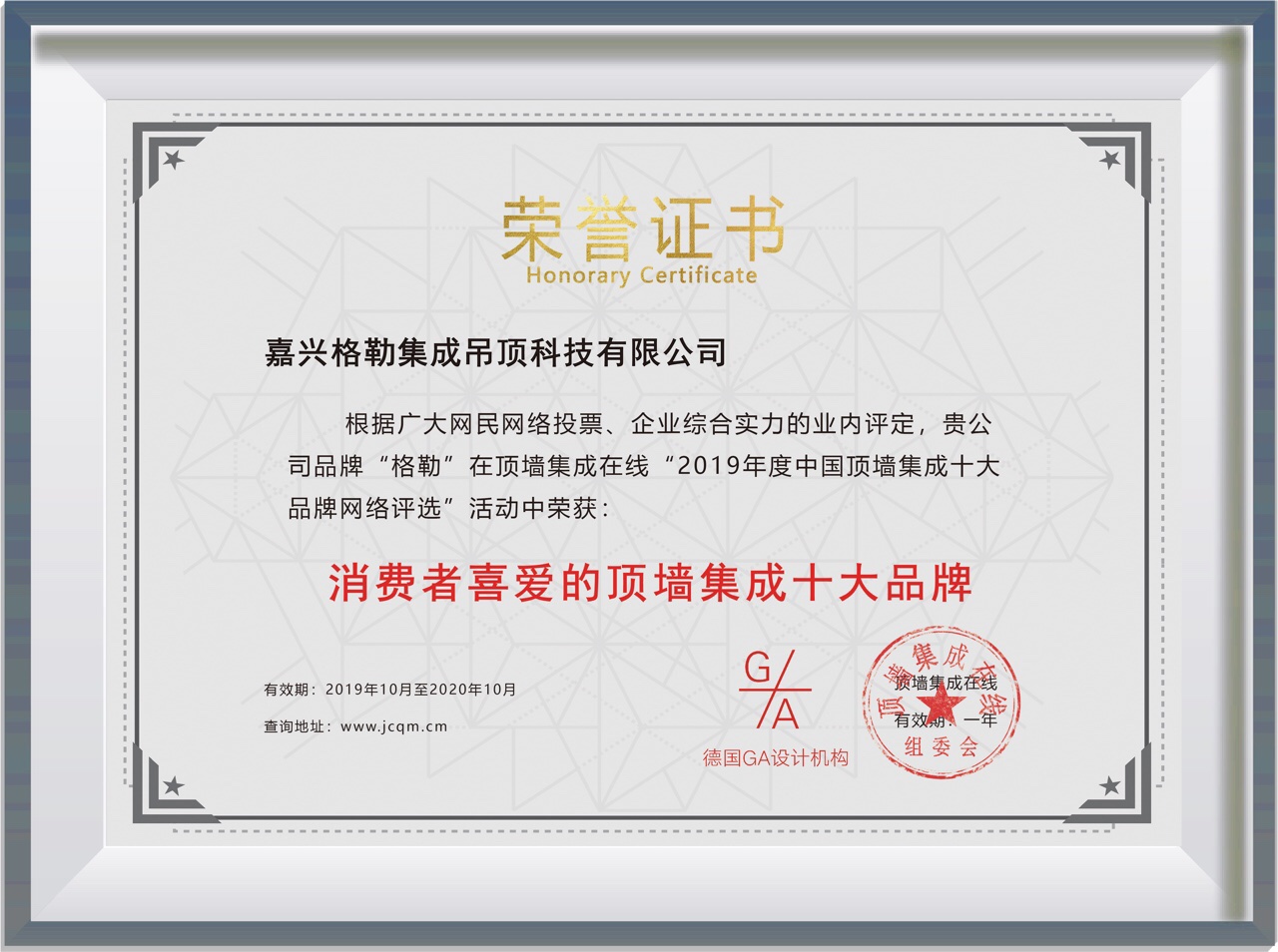 ?     10月14日,依據市場影響力和消費者口碑,在公平、公正、透明的評選機制下,由權威機構德國GA設計機構及頂墻集成在線主辦的2019年度“消費者喜愛的頂墻集成十大品牌”品牌評選結果正式揭曉。授予格勒品牌2019年度“消費者喜愛的頂墻集成十大品牌”的榮譽 。